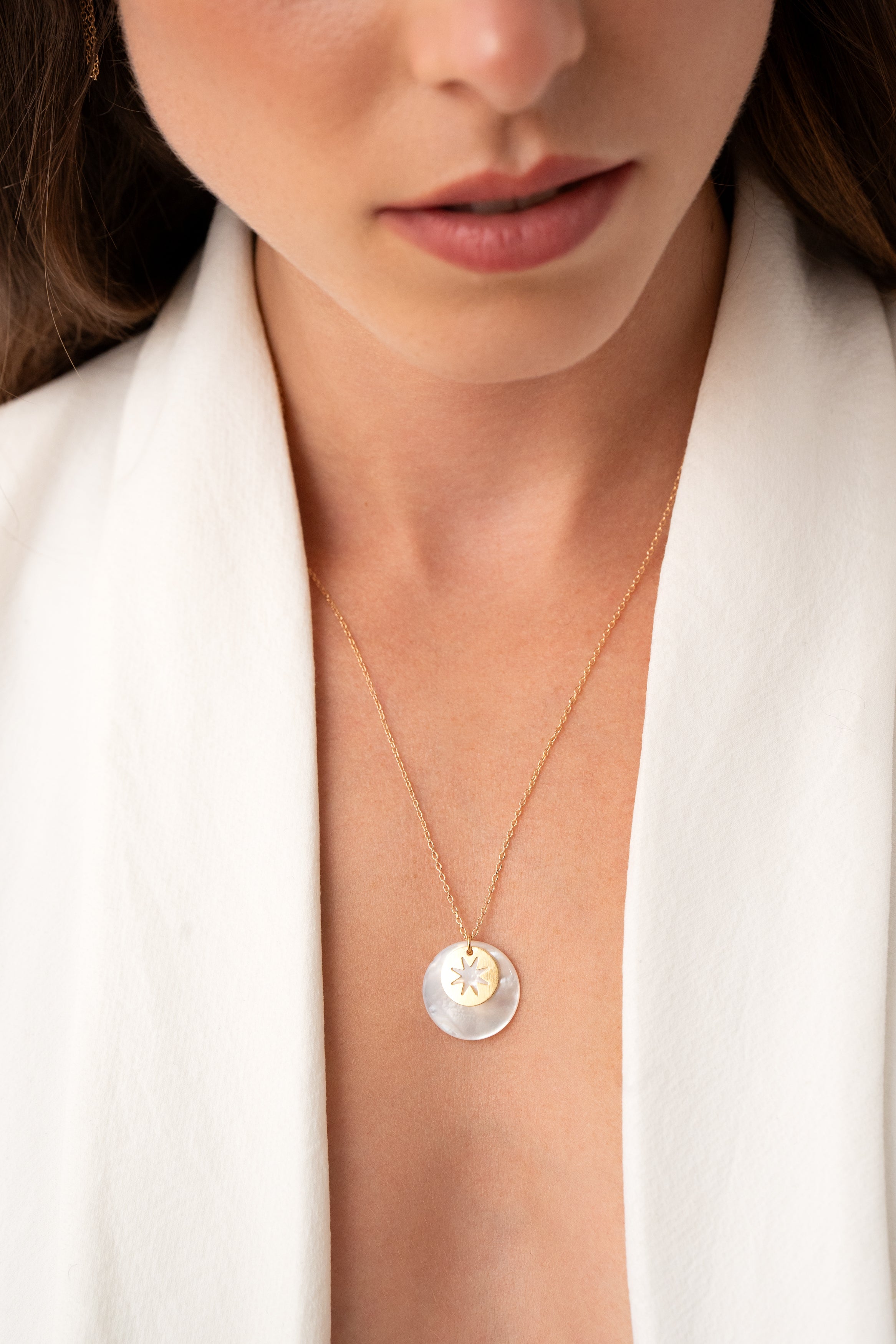 Julia incarne le charme irrésistible de deux médailles rondes superposées sur une chaîne de 50 cm. Une médaille en nacre légèrement bombée et une médaille ajourée représentant un soleil.