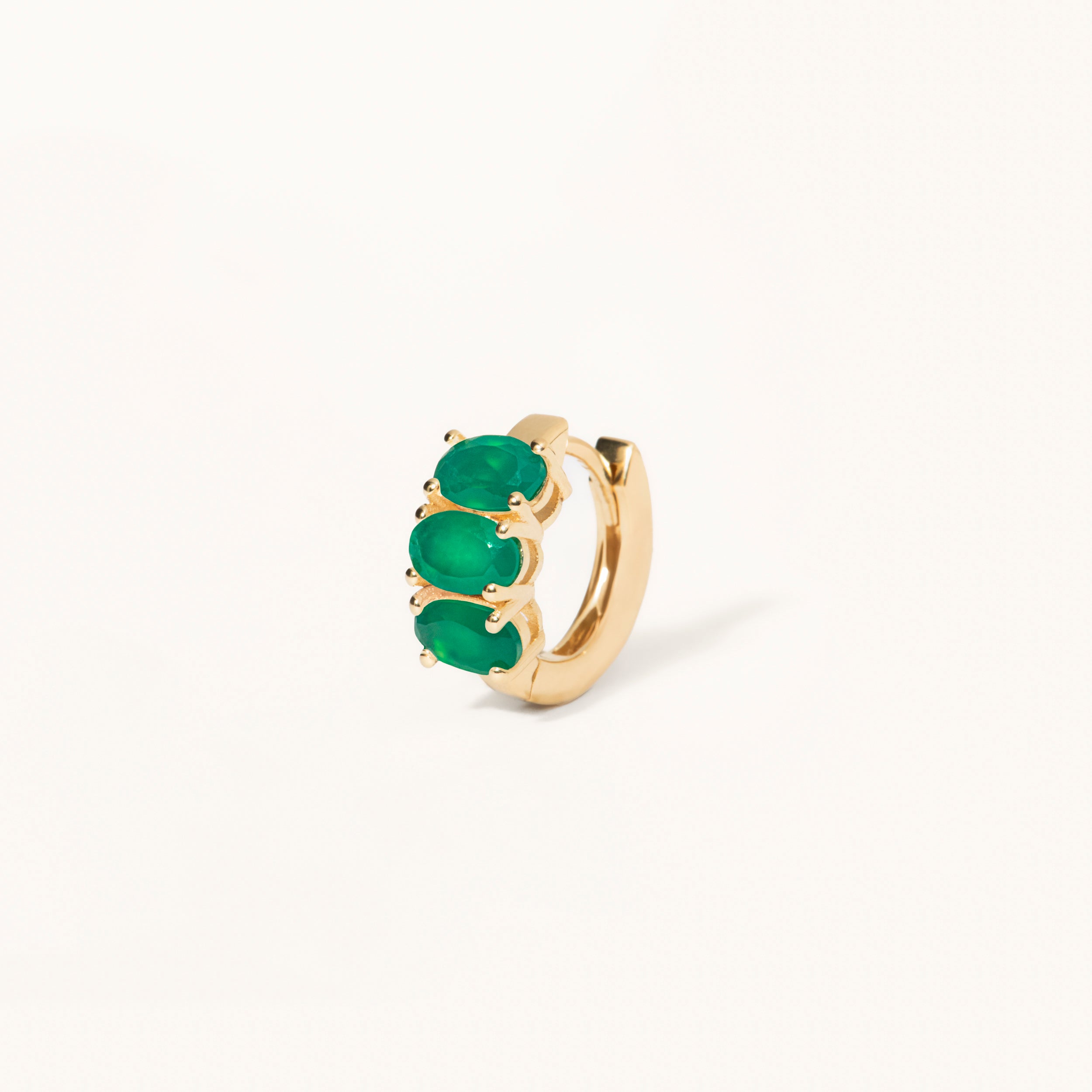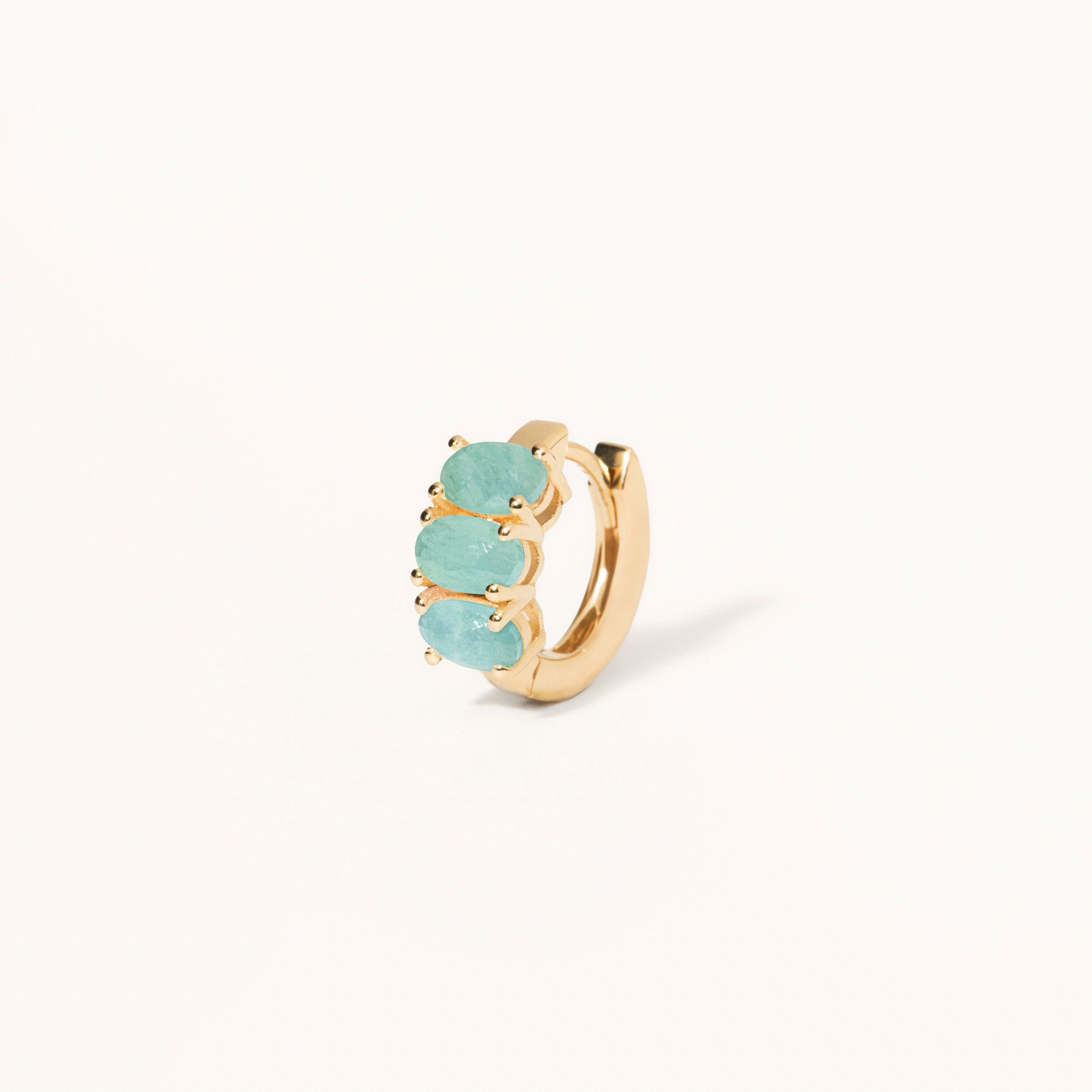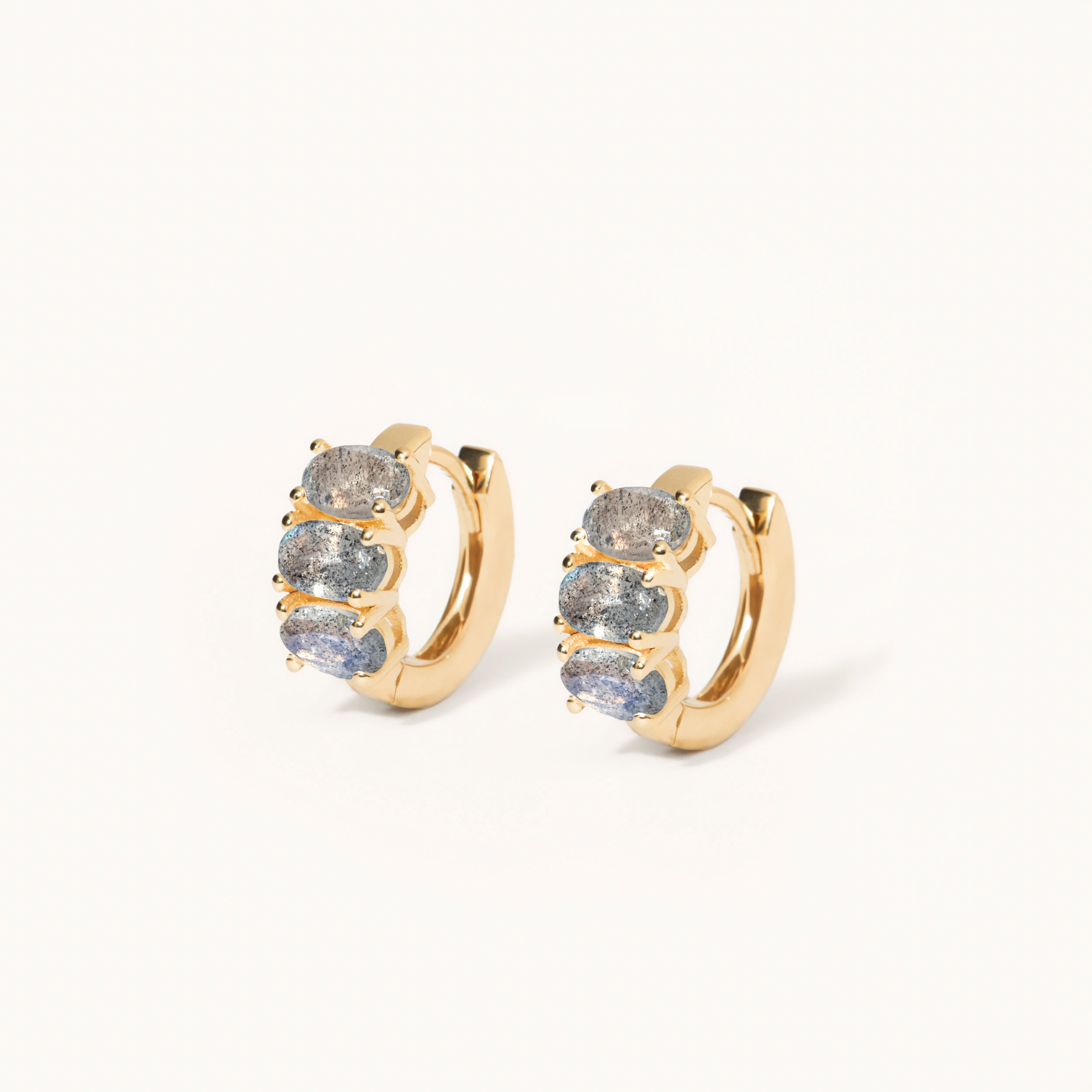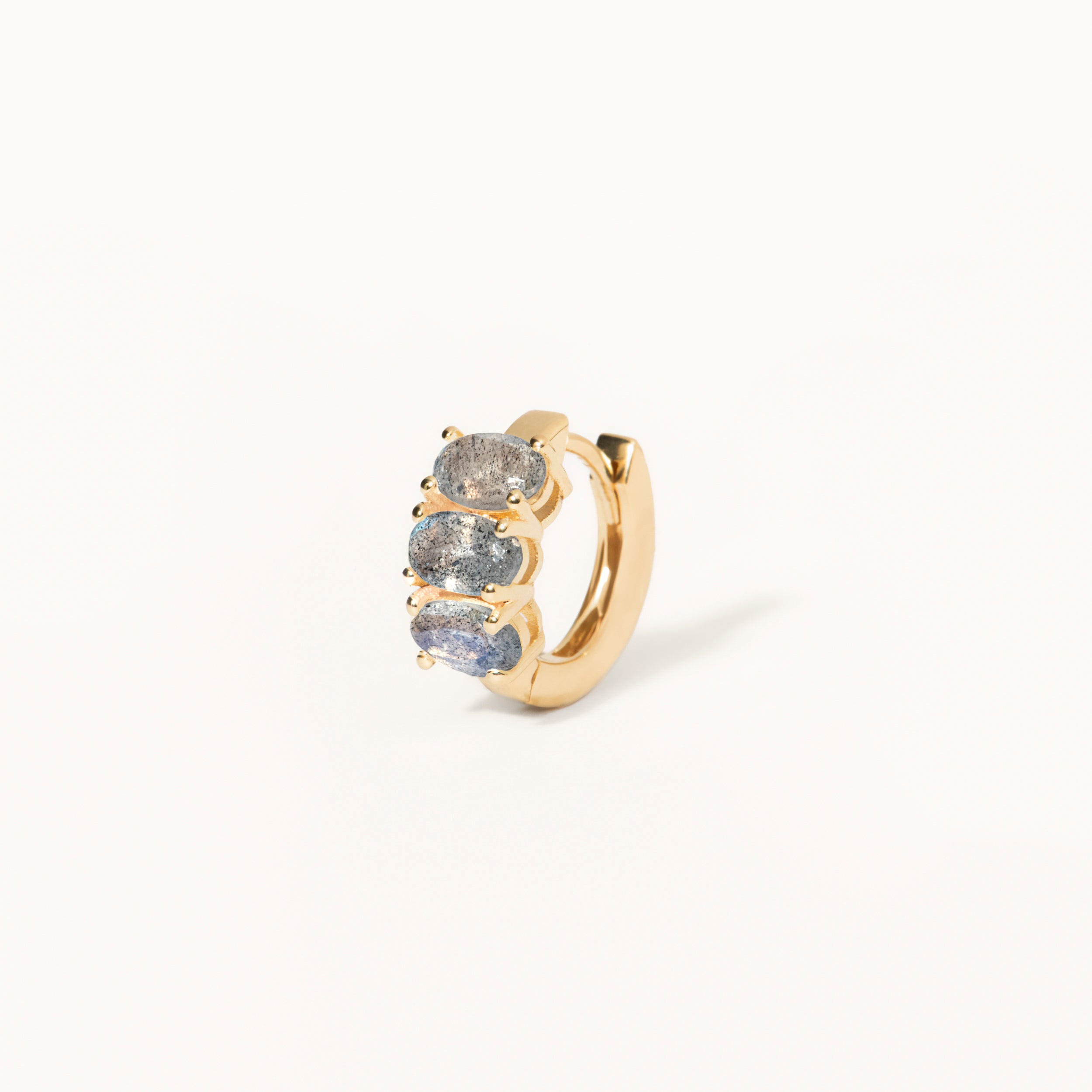 Orphée bijoux boucle d'oreilles créoles dorées à fermoir clicker de 10 mm serties de 3 pierres fines ovales facettées en labradorite, onyx vert, onyx noir, amazonite et pierre de lune, le tout en plaqué or 3 microns 750/1000. Cette boucle d'oreille peut se porter seule, en stacking ou à la paire