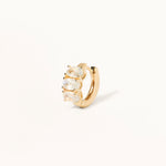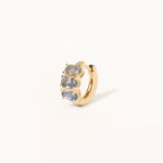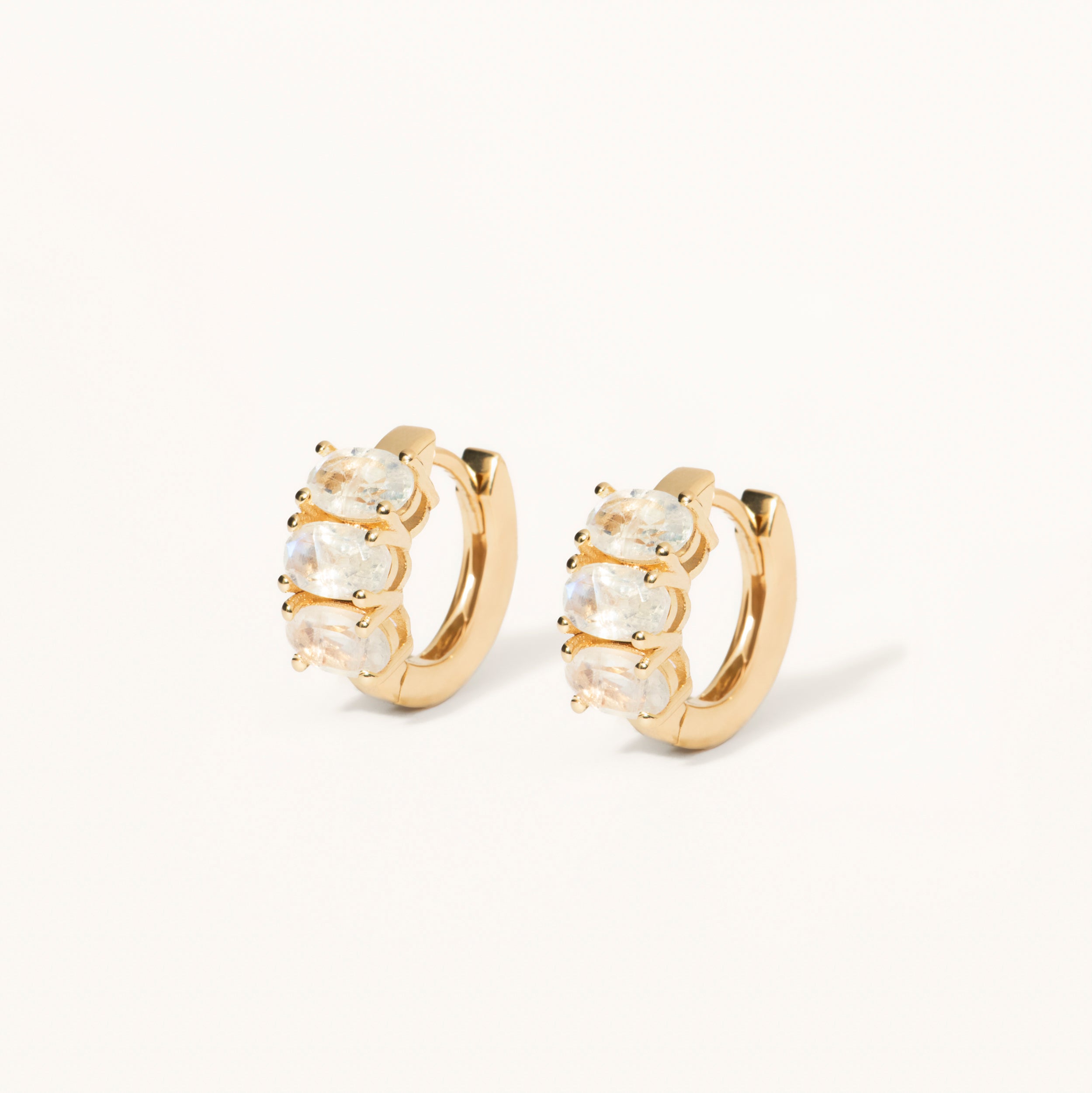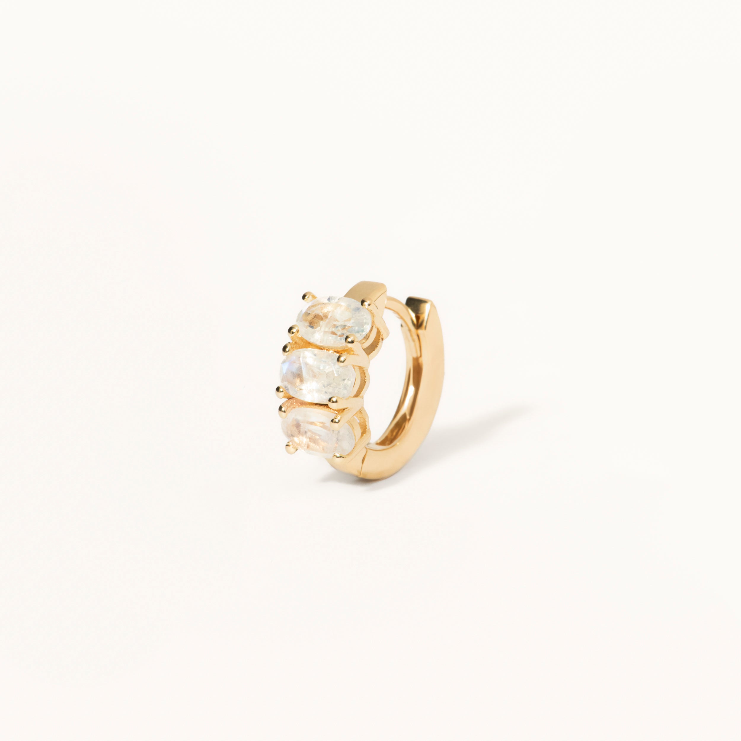 exemple d'une oreille avec accumulation de 3 boucles d'oreilles en pierre de lune marque orphée bijoux , une  premièere mini créole qui comporte 3 pierre de lune ovale - créole - boucle d'oreille - pierre fine - stacking 2 puces et 1 mini créole - pierre précieuse et or