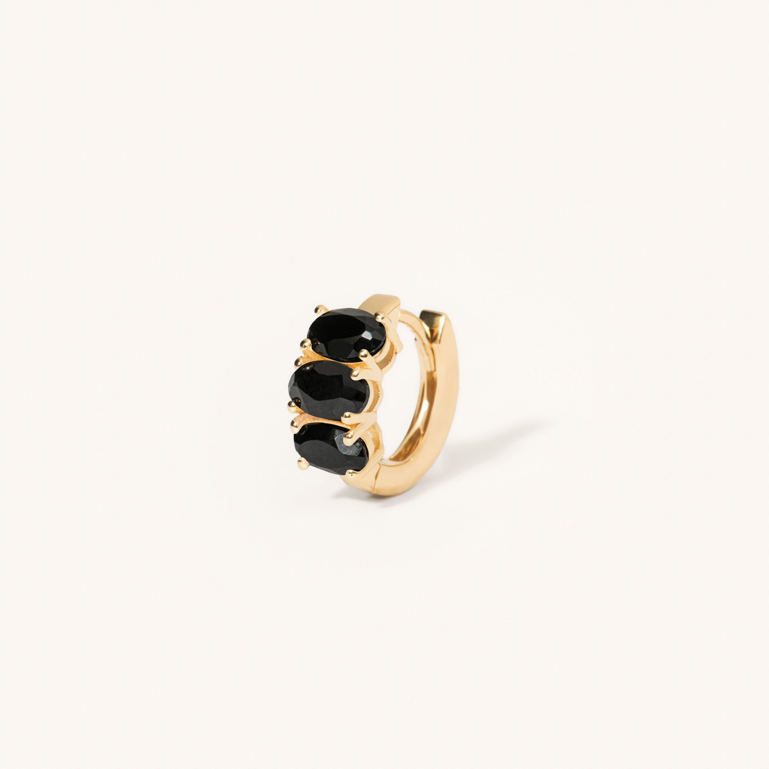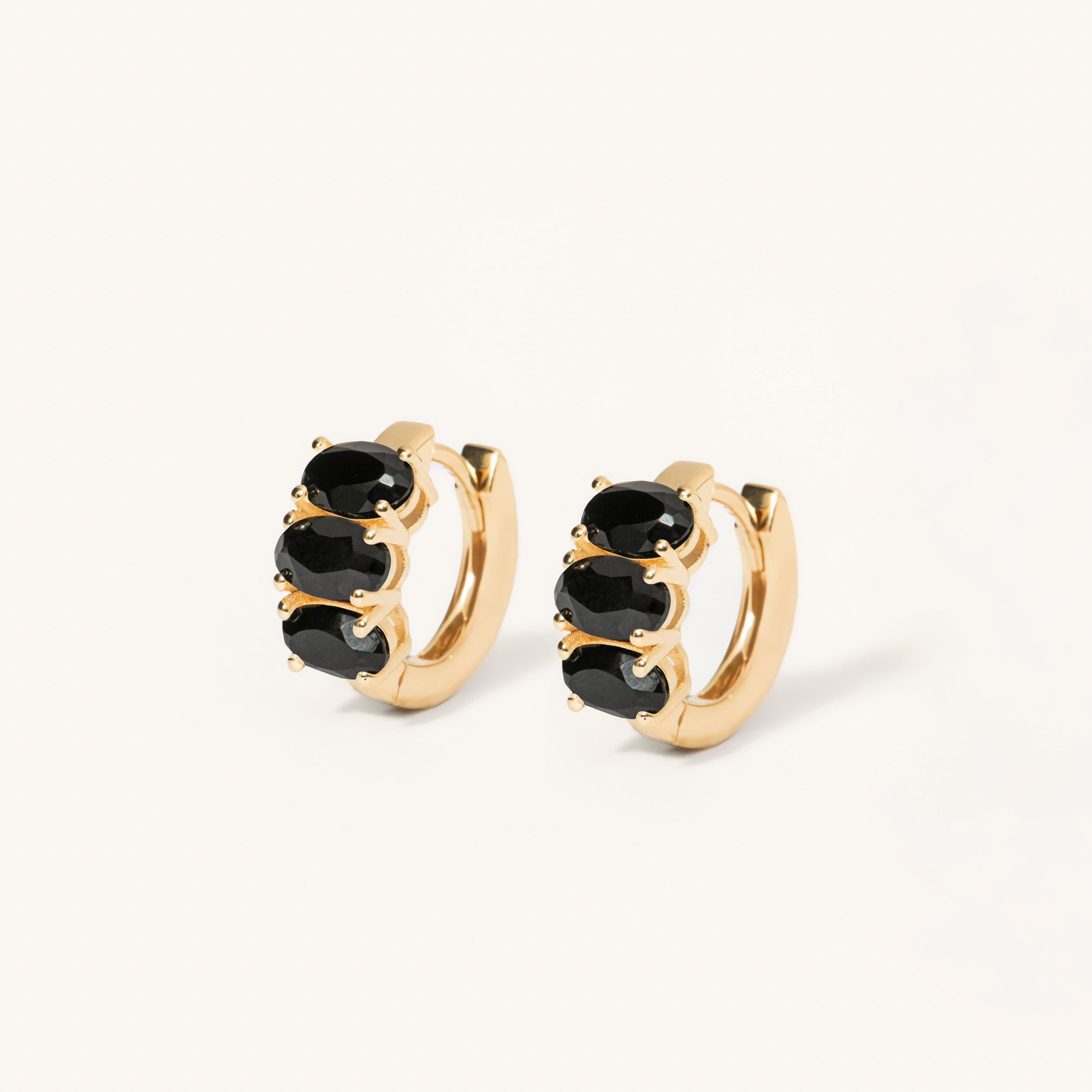 Orphée bijoux Paire de boucle d'oreilles créoles dorées à fermoir clicker de 10 mm serties de 3 pierres fines ovales facettées en onyx noir, le tout en plaqué or 3 microns 750/1000.