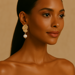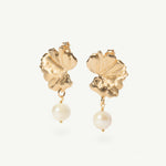Boucles d’oreilles Apolline Orphée Bijoux en plaqué or champagne avec grosses perles d’eau douce blanche naturelle et motif floral  feuille fleur ideal pour mariage
