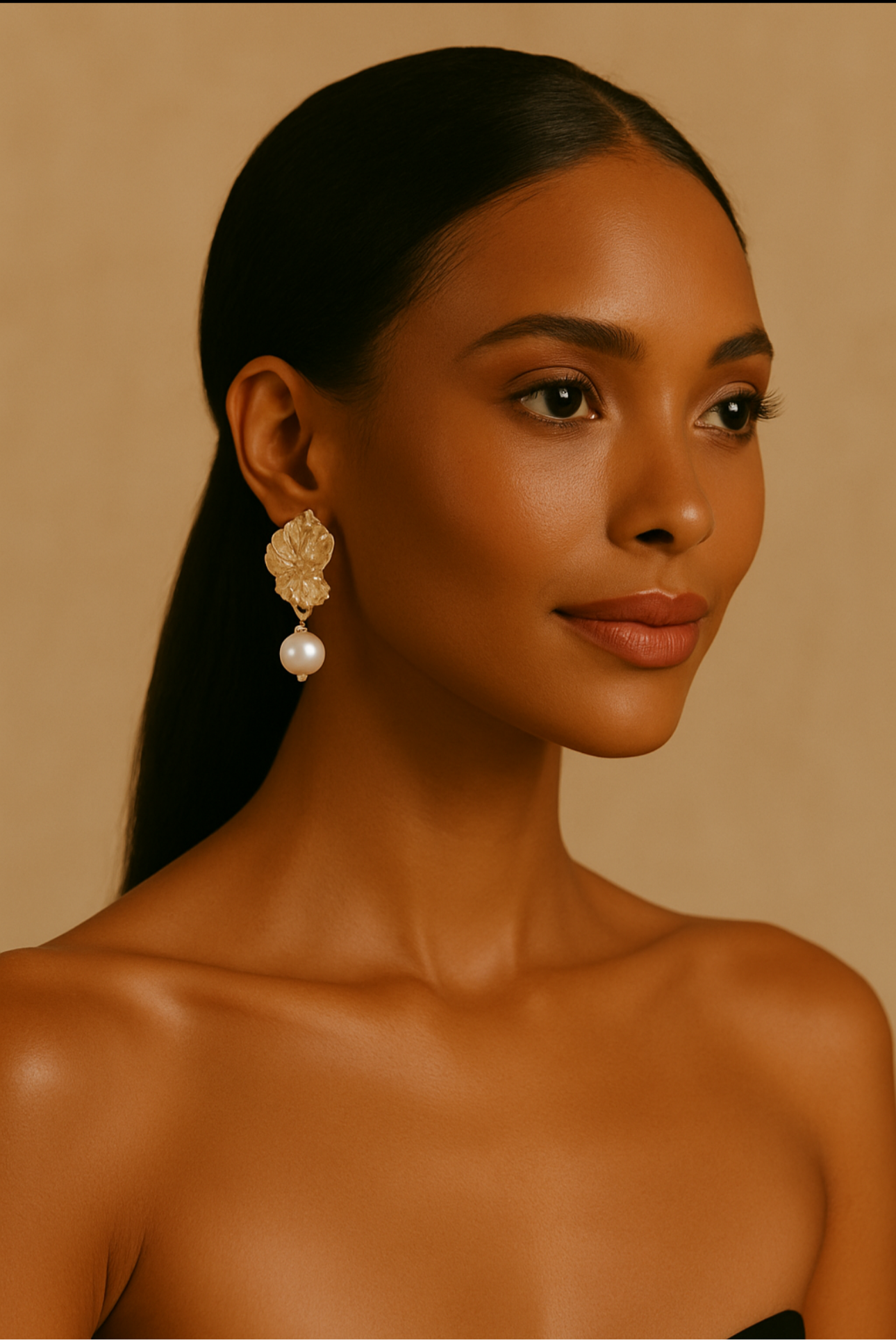 Femme noir qui porte une boucle d'oreille dorée en forme de feuille avec une perle d'eau douces pendantes en dessous. Plus haut sur le cartilage de l'oreille , il y a deux earcuffs dorés. c'est un bijou qui capte la lumière et qui souligne l'élégance naturelle