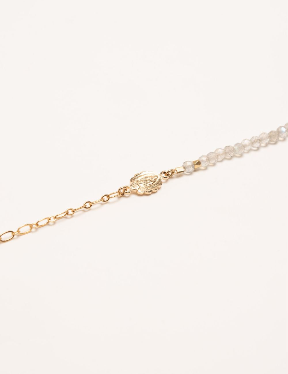 One side threaded with faceted natural fine stone beads of your choice from labradorite, green onyx, black onyx, lapis lazuli, amazonite, blue sapphire, emerald green or freshwater pearl, and on the other side a curb chain, both connected by a golden connector, from cowrie shell, engraved tube, holy virgin or cross.