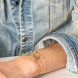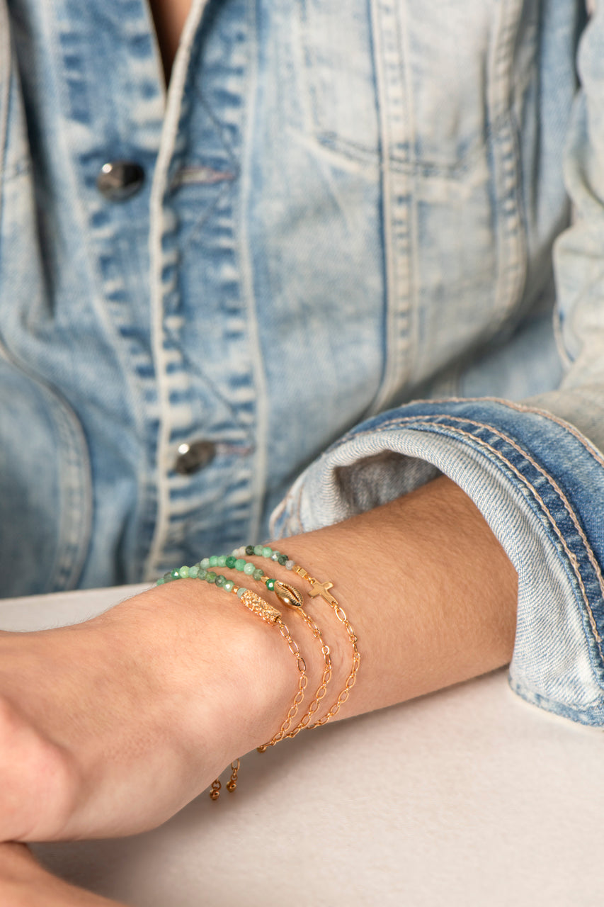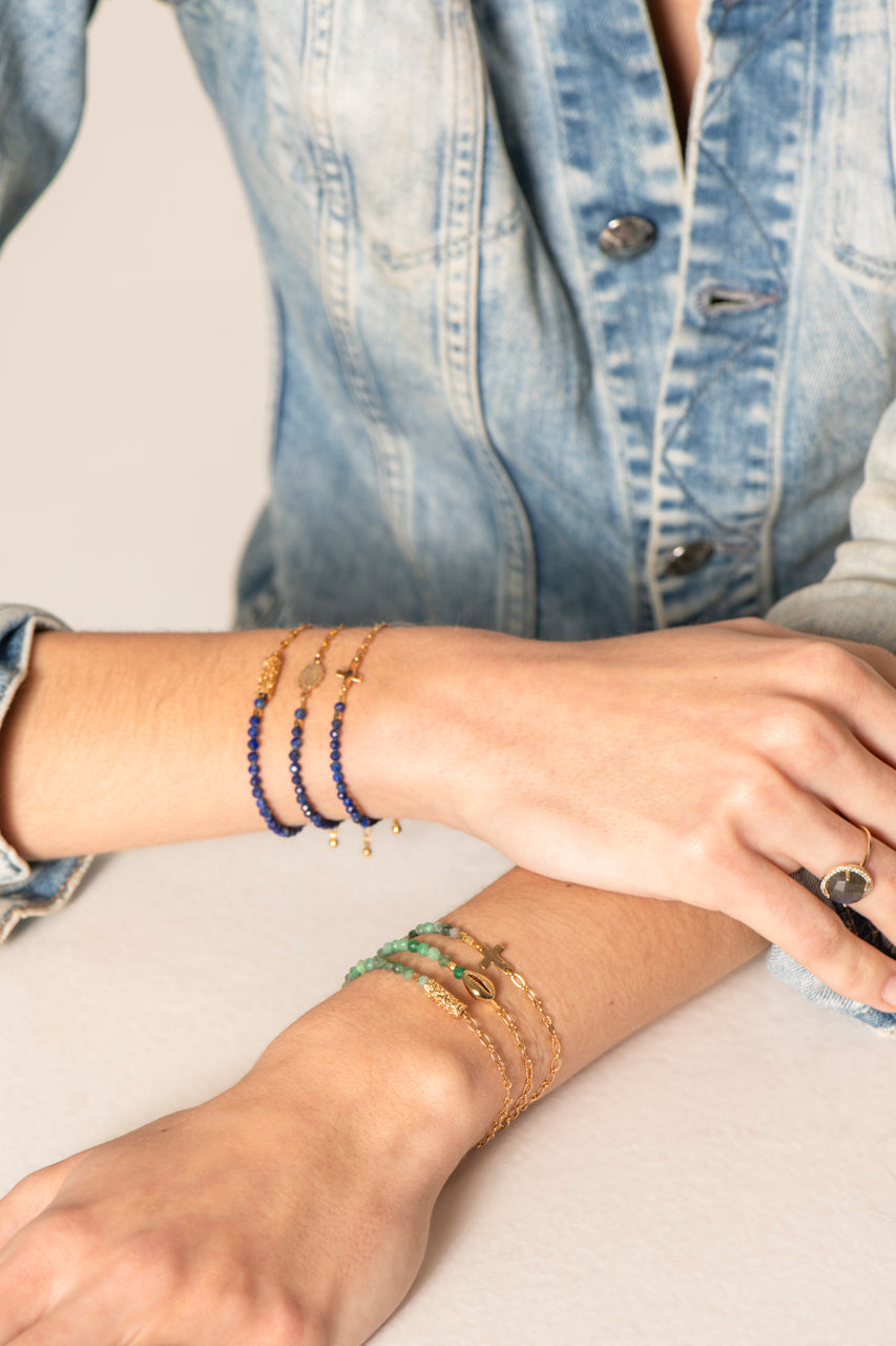 accumulation des bracelets rachel saphir connecteur tube balinais mini vierge mini croix mini coquillage cauri bracelets ajustables réglables pierres naturelles saphir et chaine dorée jonc martelé alba