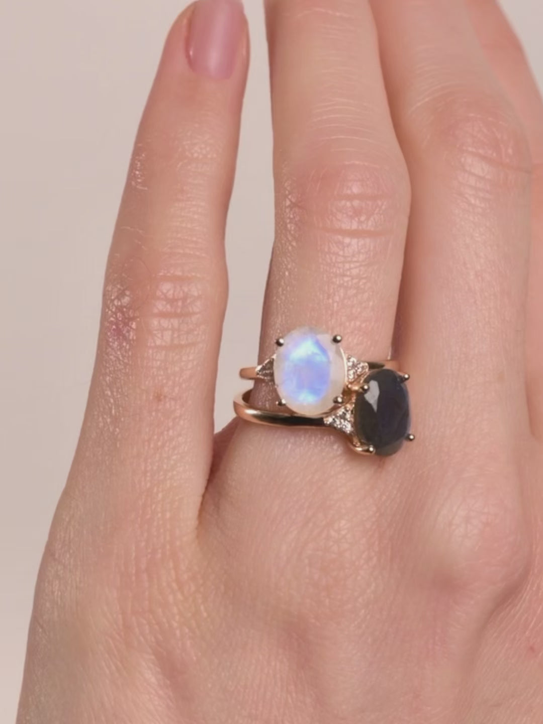 Plongez dans l'éther de l'élégance avec les nouvelles bagues Cloud, deux œuvres d'art exquises qui fusionnent l'éclat naturel de la labradorite et de la pierre de lune dans un style résolument Art Déco.