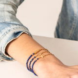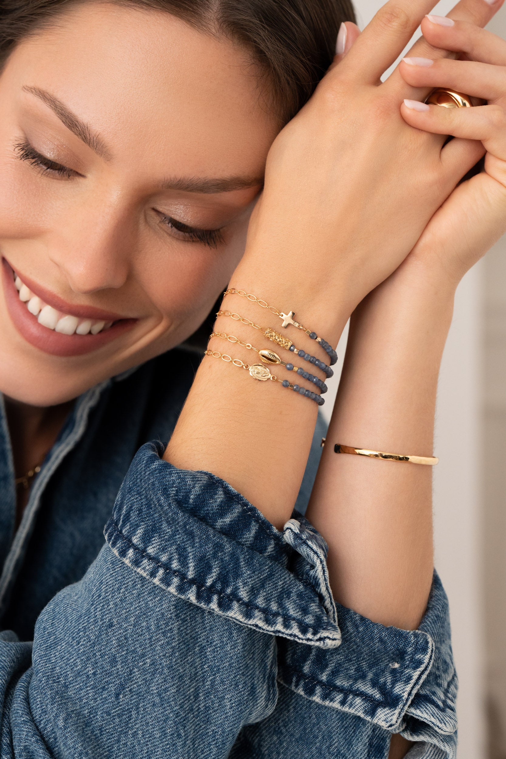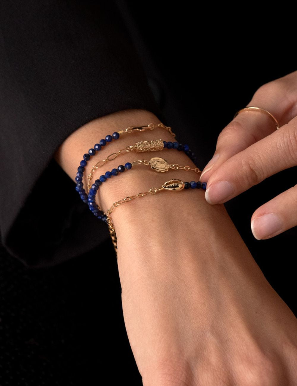 accumulation des bracelets rachel saphir connecteur tube balinais mini vierge mini croix mini coquillage cauri bracelets ajustables réglables pierres naturelles saphir et chaine dorée jonc martelé alba