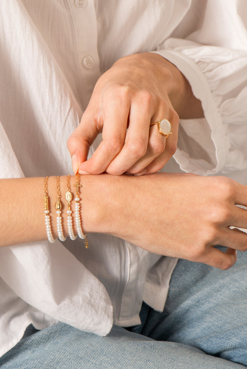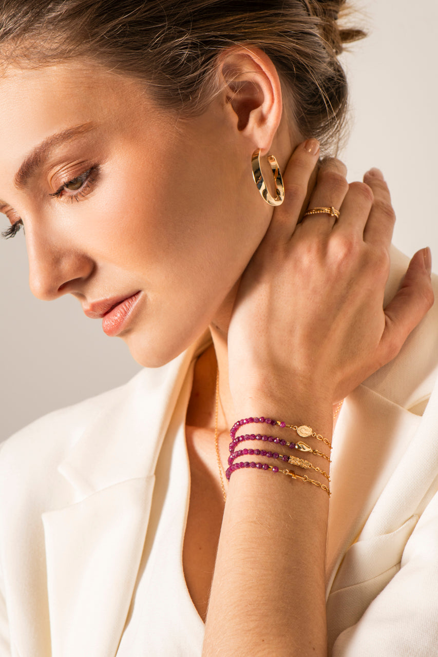 D'un côté, de ravissantes pierres fines taillées en facettes, offrant une touche d'élégance et de raffinement à votre poignet ; et de l'autre côté, une délicate chaîne fine gourmette dorée, rejointe par un connecteur coquillage appelé cauri.