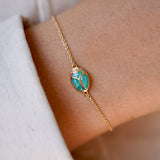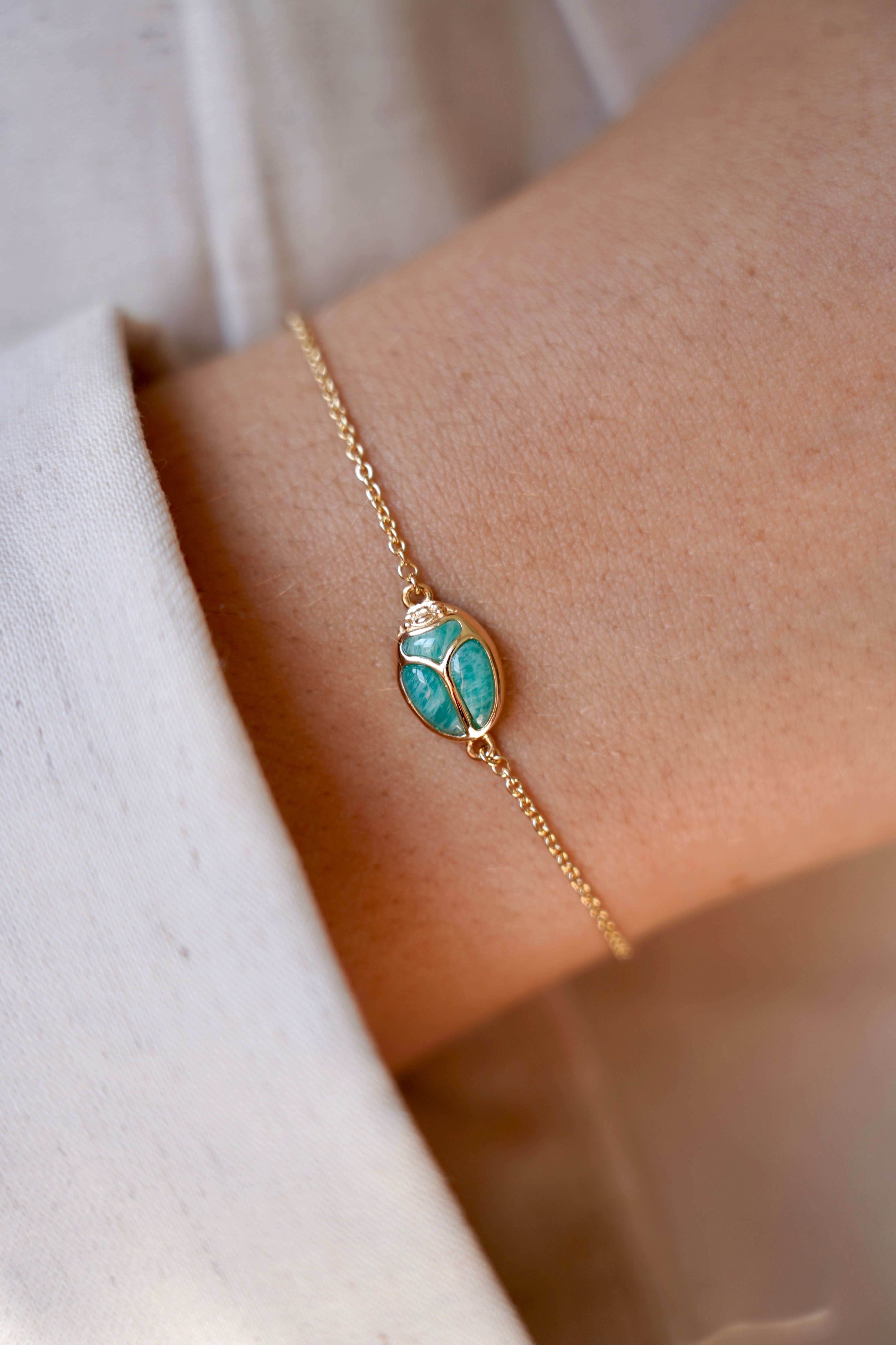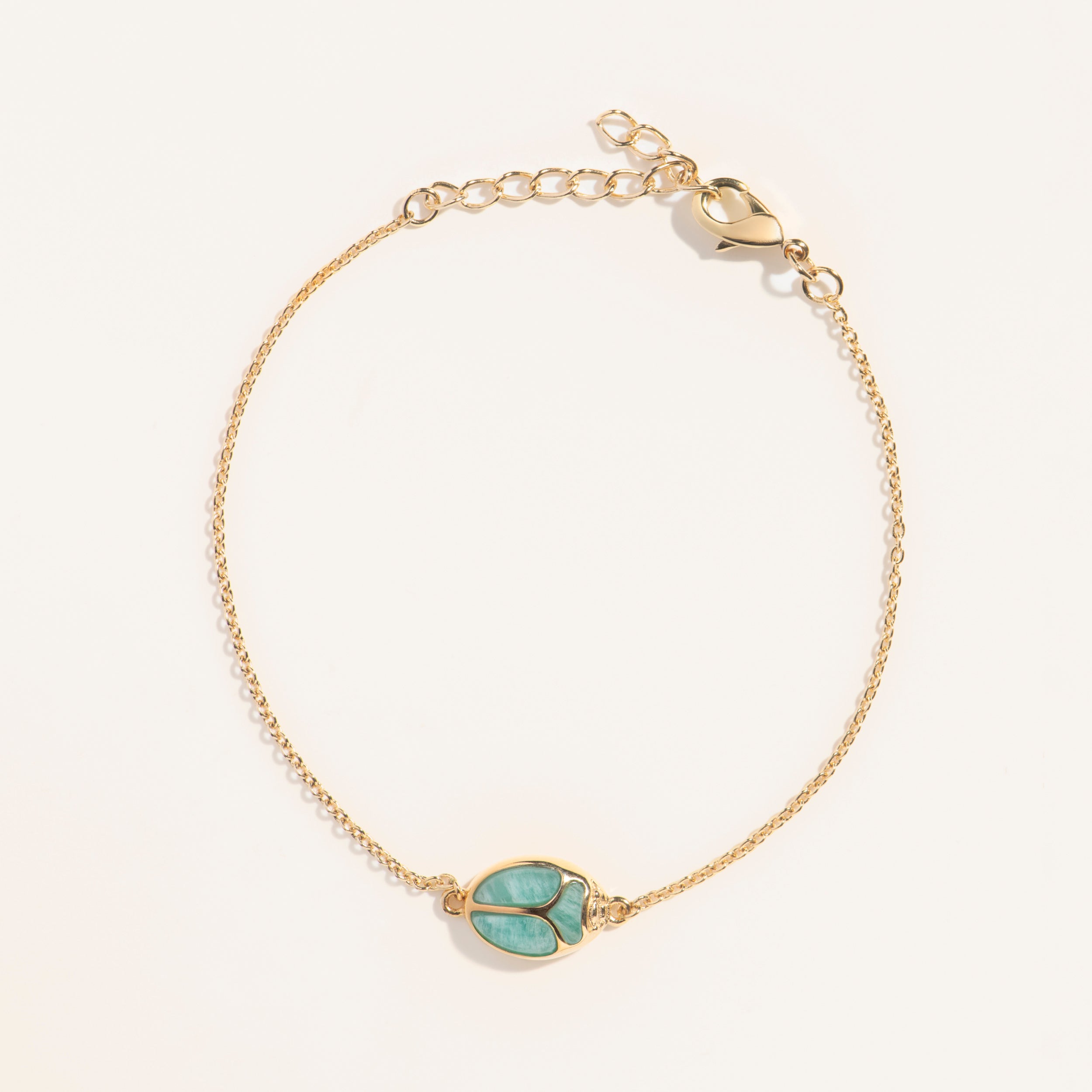 bracelet chaine avec Scarabée en pierres fines, amazonite, porté sur un poigné, plaqué or, 3 microns, symbole de renaissance