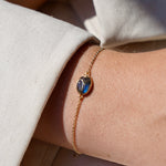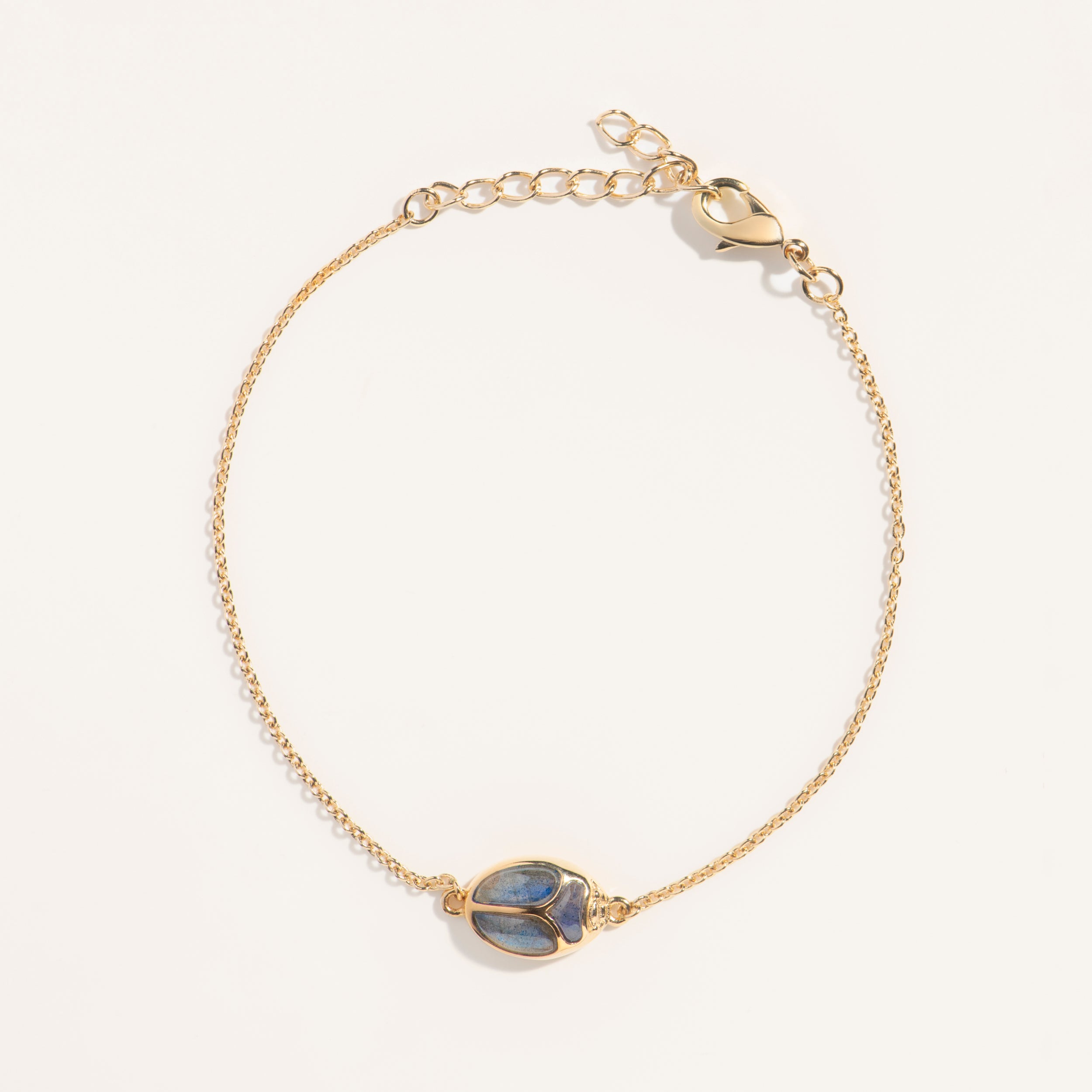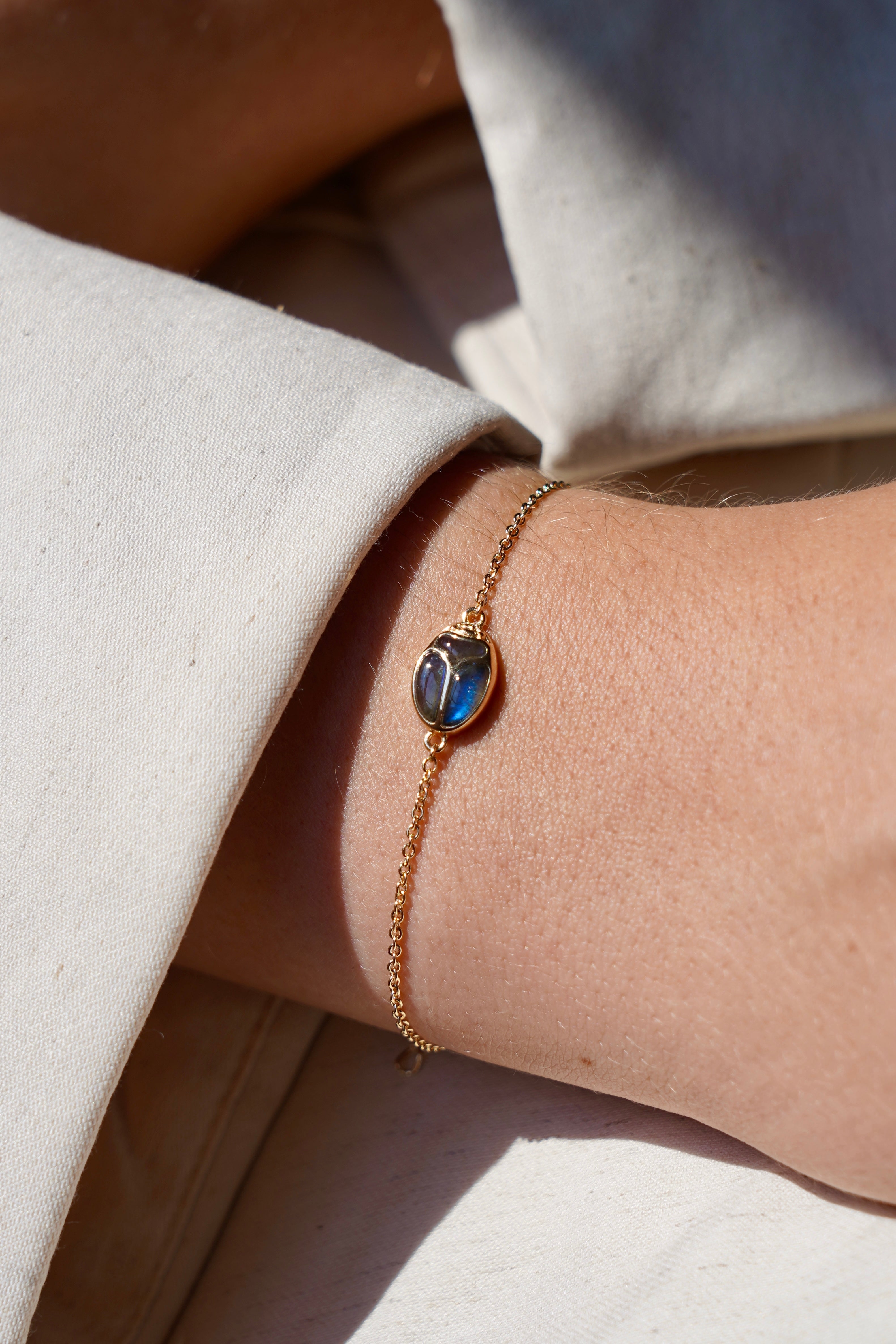 bracelet chaine avec Scarabée en pierres fines, labradorite, porté sur un poigné, plaqué or, 3 microns, symbole de renaissance