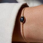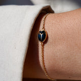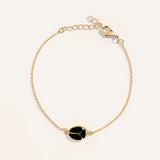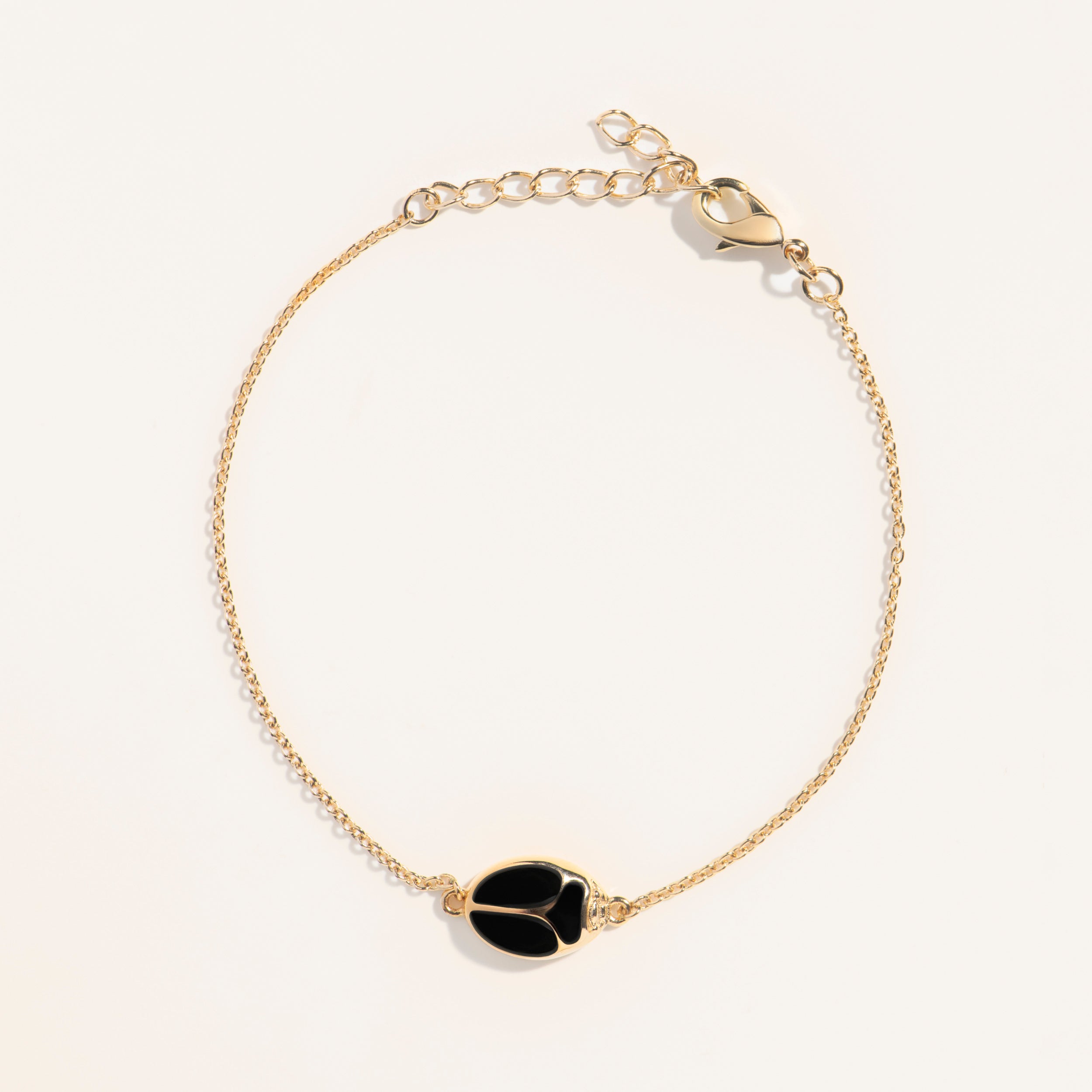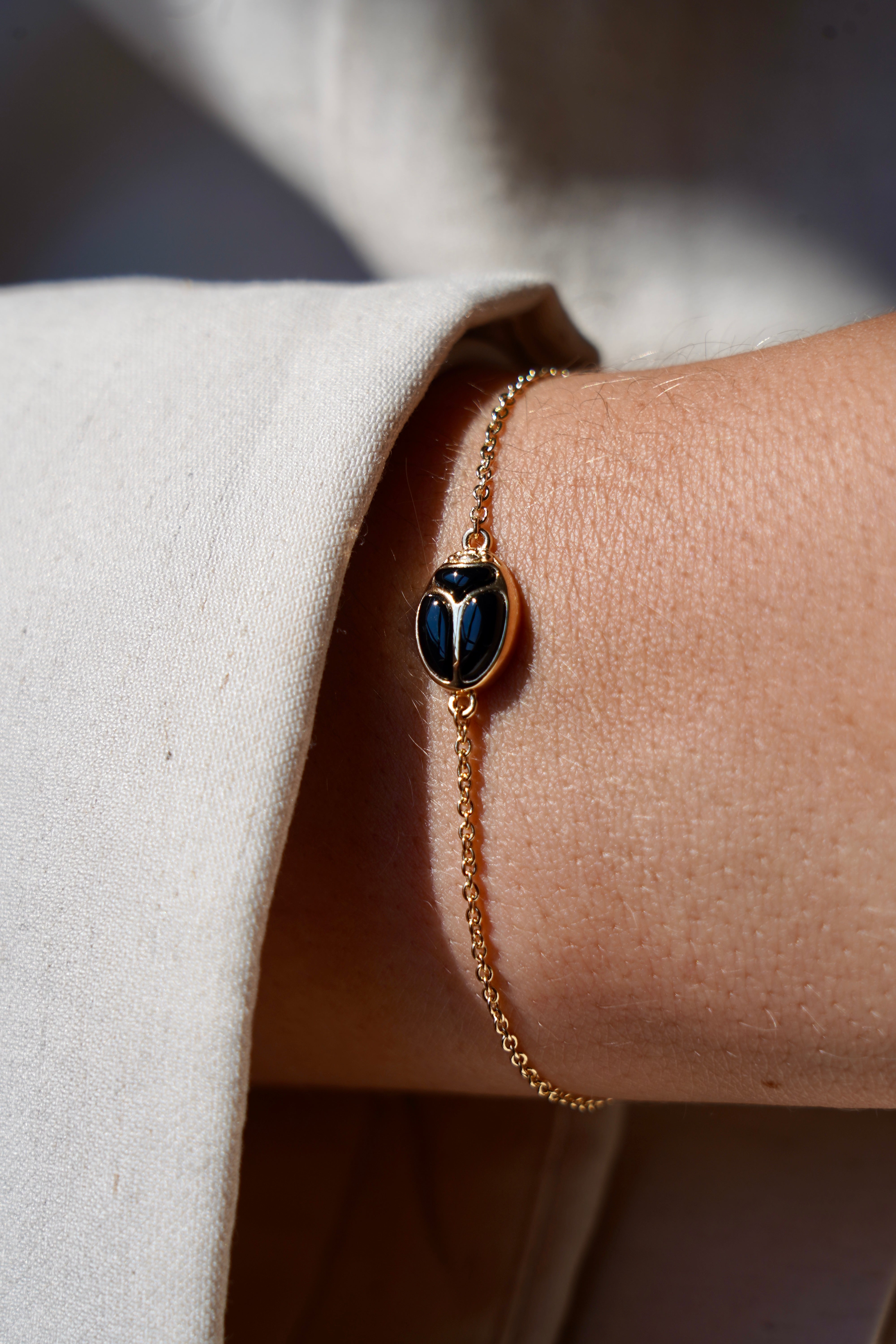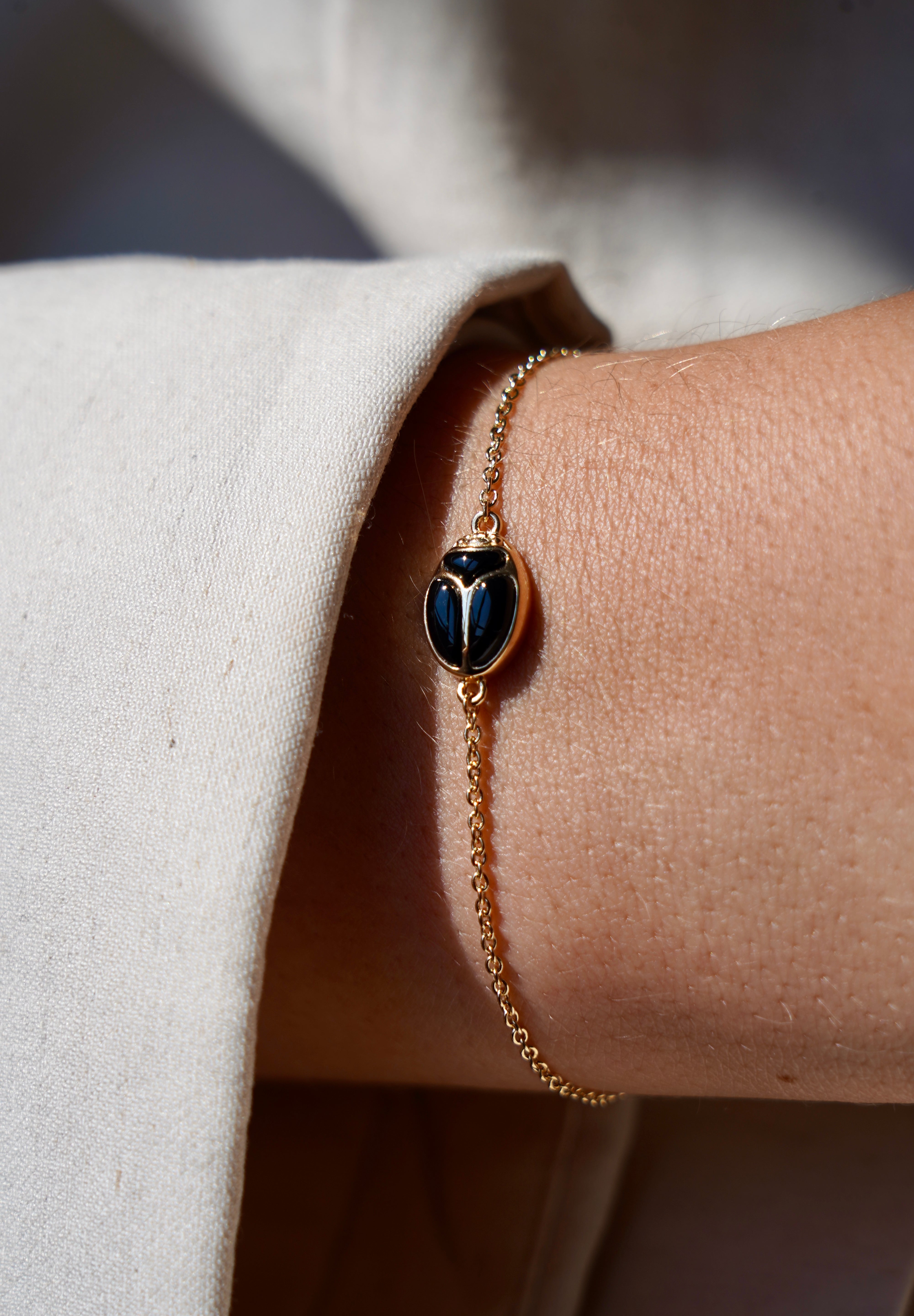 bracelet chaine avec Scarabée en pierres fines, onyx noir, porté sur un poigné, plaqué or, 3 microns, symbole de renaissance