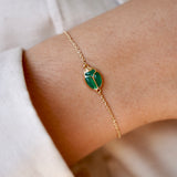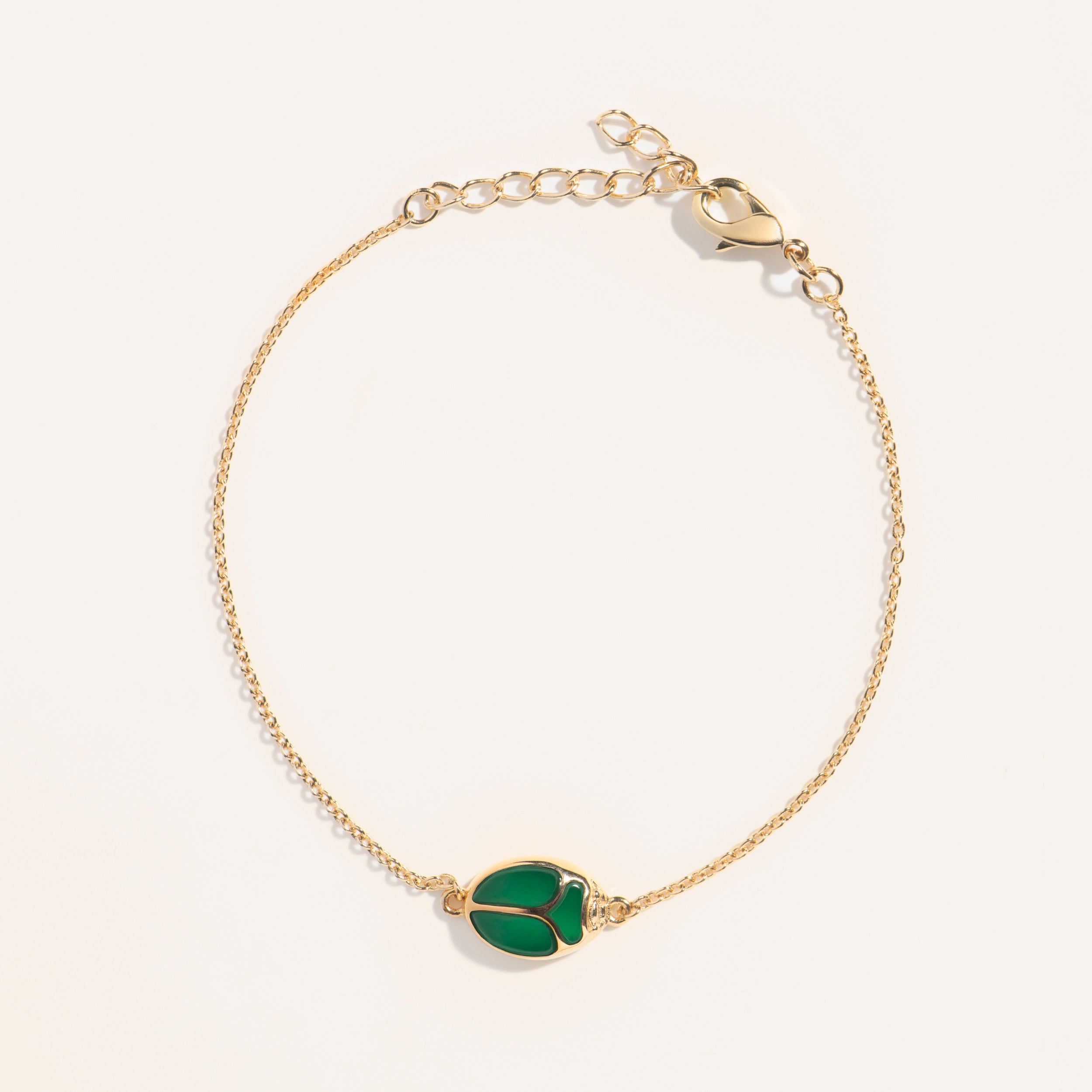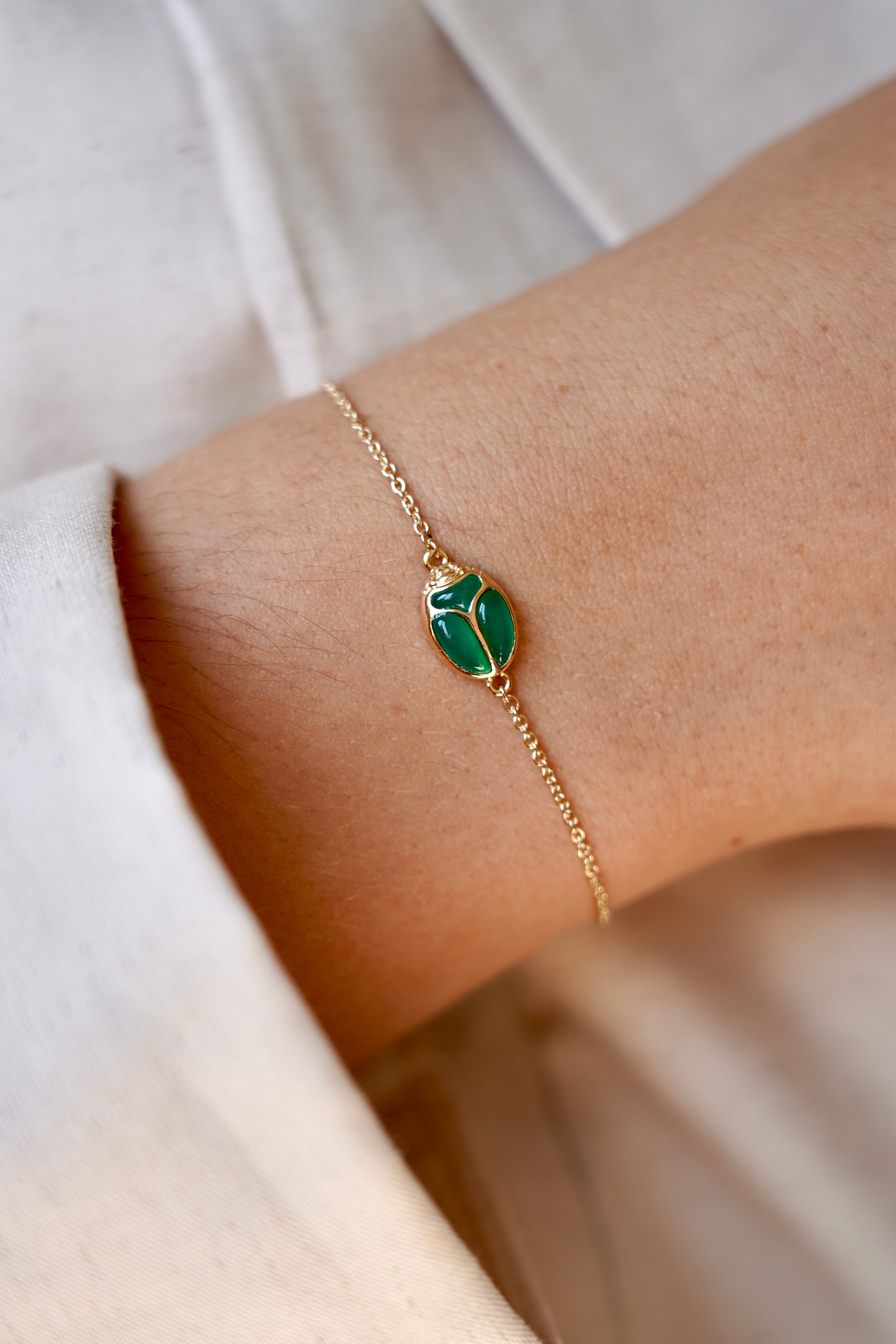 bracelet chaine avec Scarabée en pierres fines, onyx vert, porté sur un poigné, plaqué or, 3 microns, symbole de renaissance