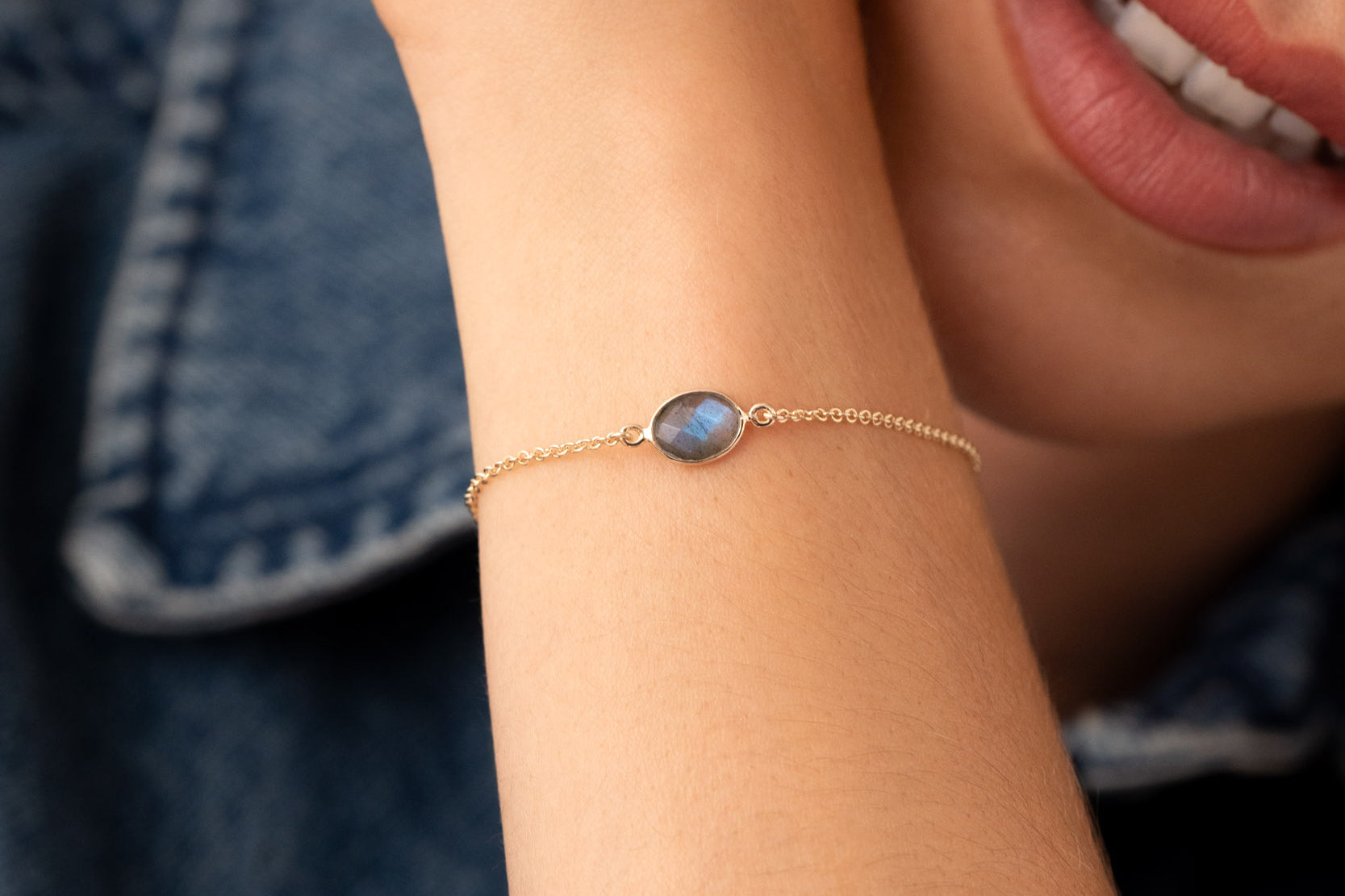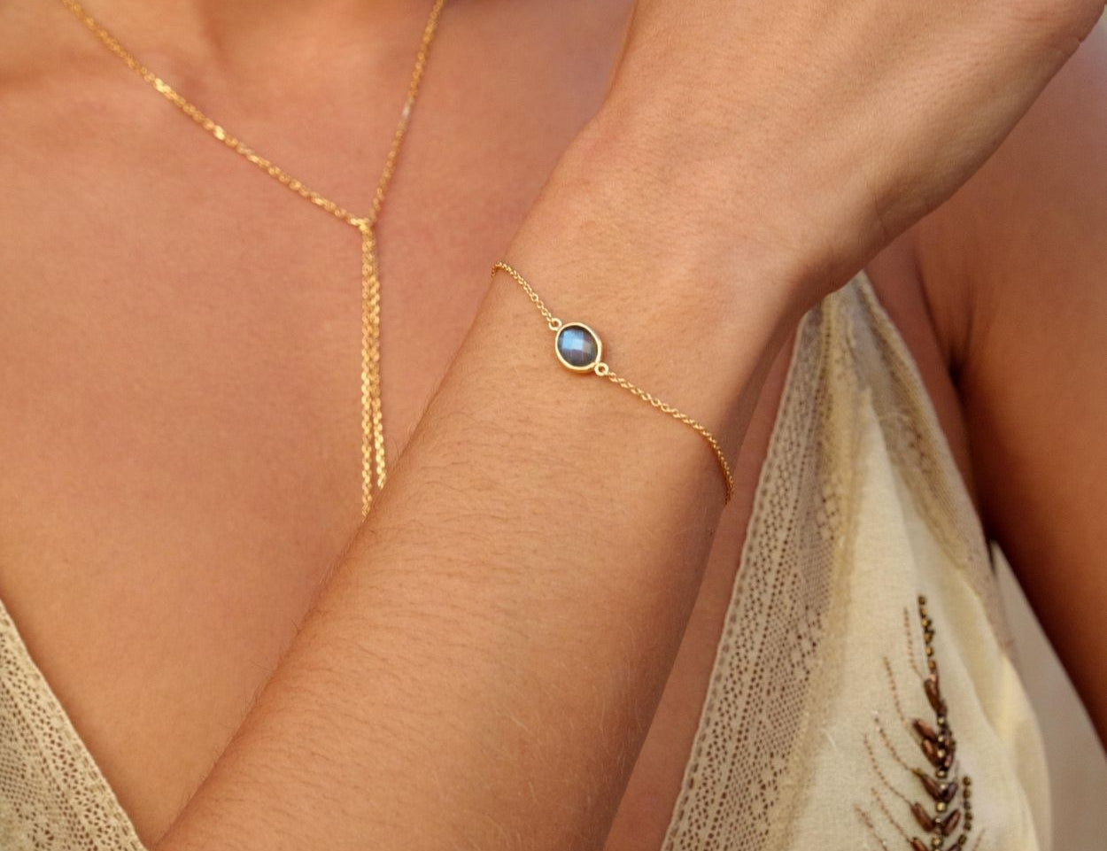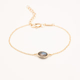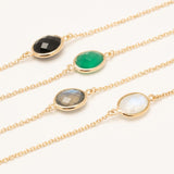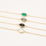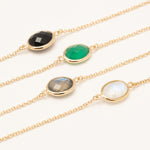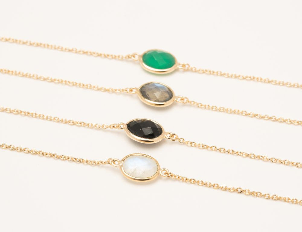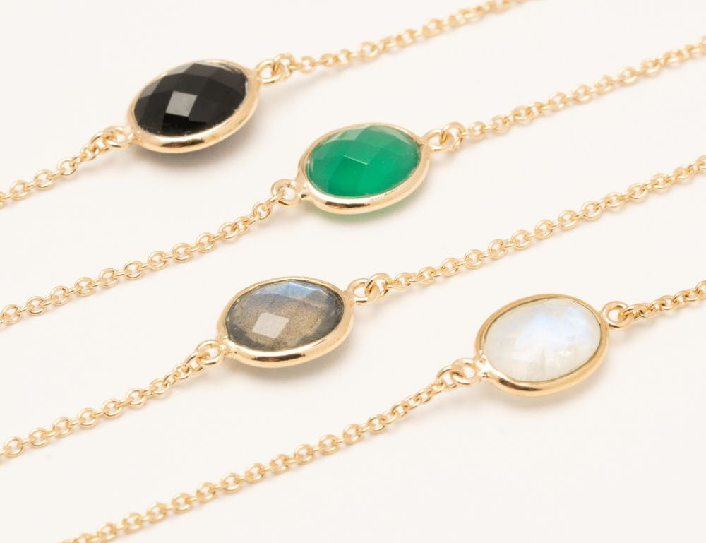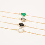 Bracelet chaîne et pierre fine ovale, labradorite, pierre de lune, onyx noir, onyx vert, amazonite. Plaqué or 3 microns 750/1000. Bijou de peau. Petit prix
