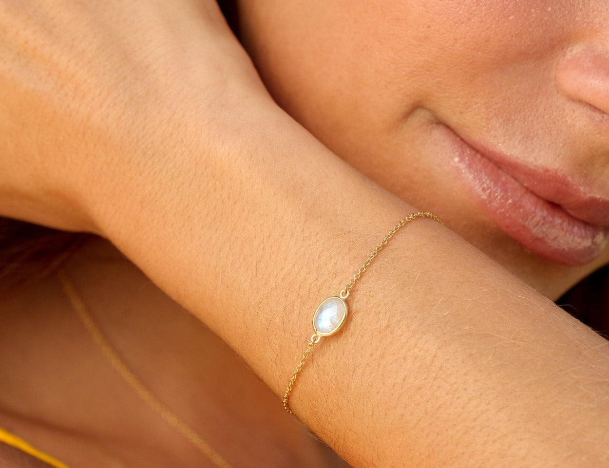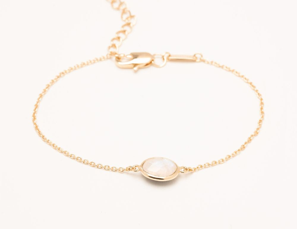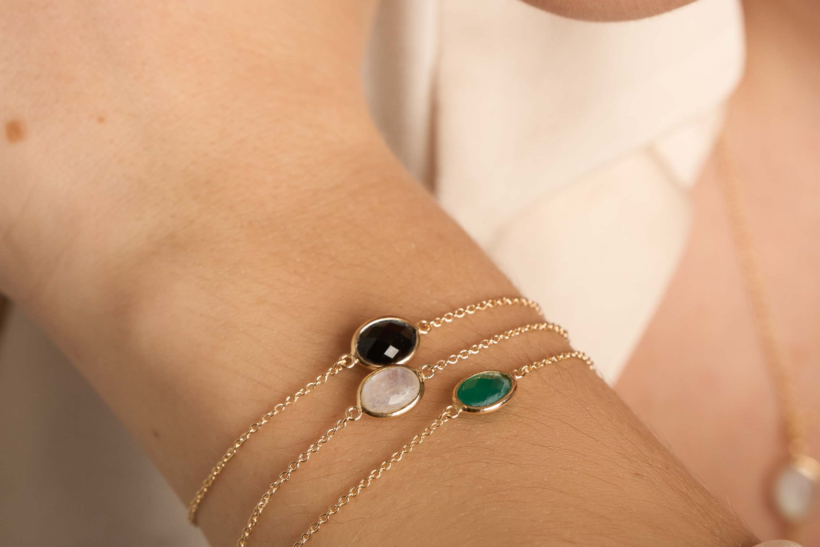 Bracelet chaîne et pierre fine ovale, labradorite, pierre de lune, onyx noir, onys vert, amazonite. Plaqué or 3 microns 750/1000. Bijou de peau. Petit prix