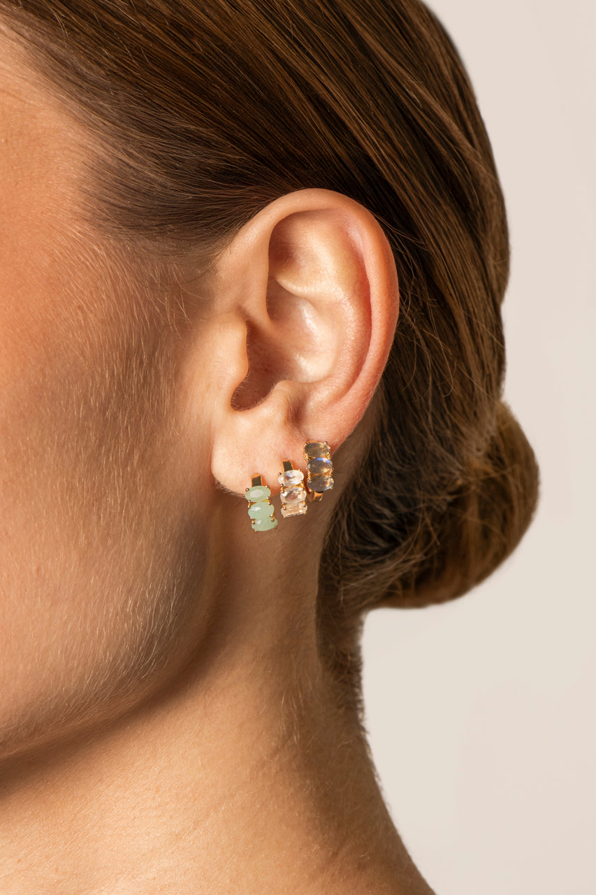 Orphée bijoux boucle d'oreilles créoles dorées à fermoir clicker de 10 mm serties de 3 pierres fines ovales facettées en labradorite, onyx vert, onyx noir, amazonite et pierre de lune, le tout en plaqué or 3 microns 750/1000. Cette boucle d'oreille peut se porter seule, en stacking ou à la paire