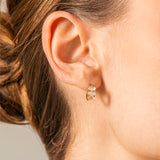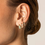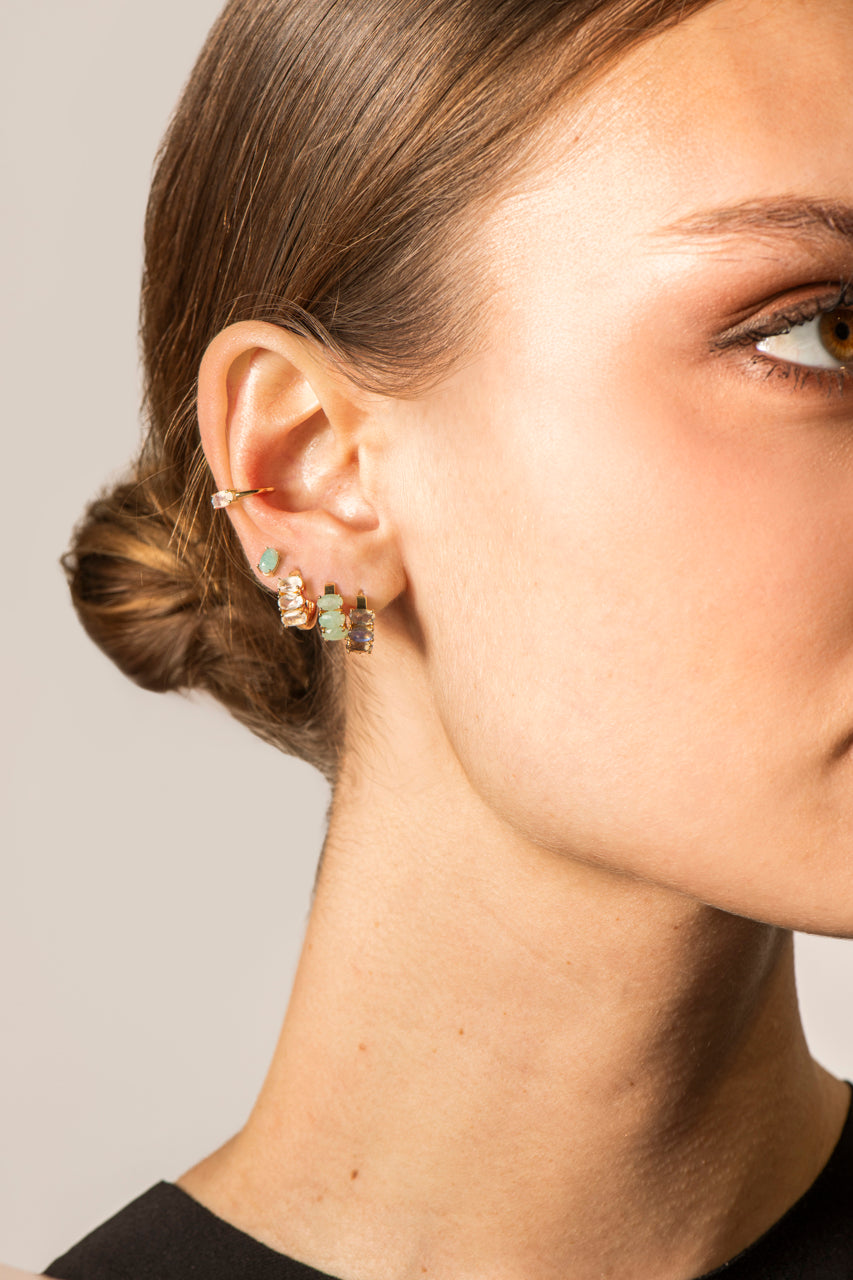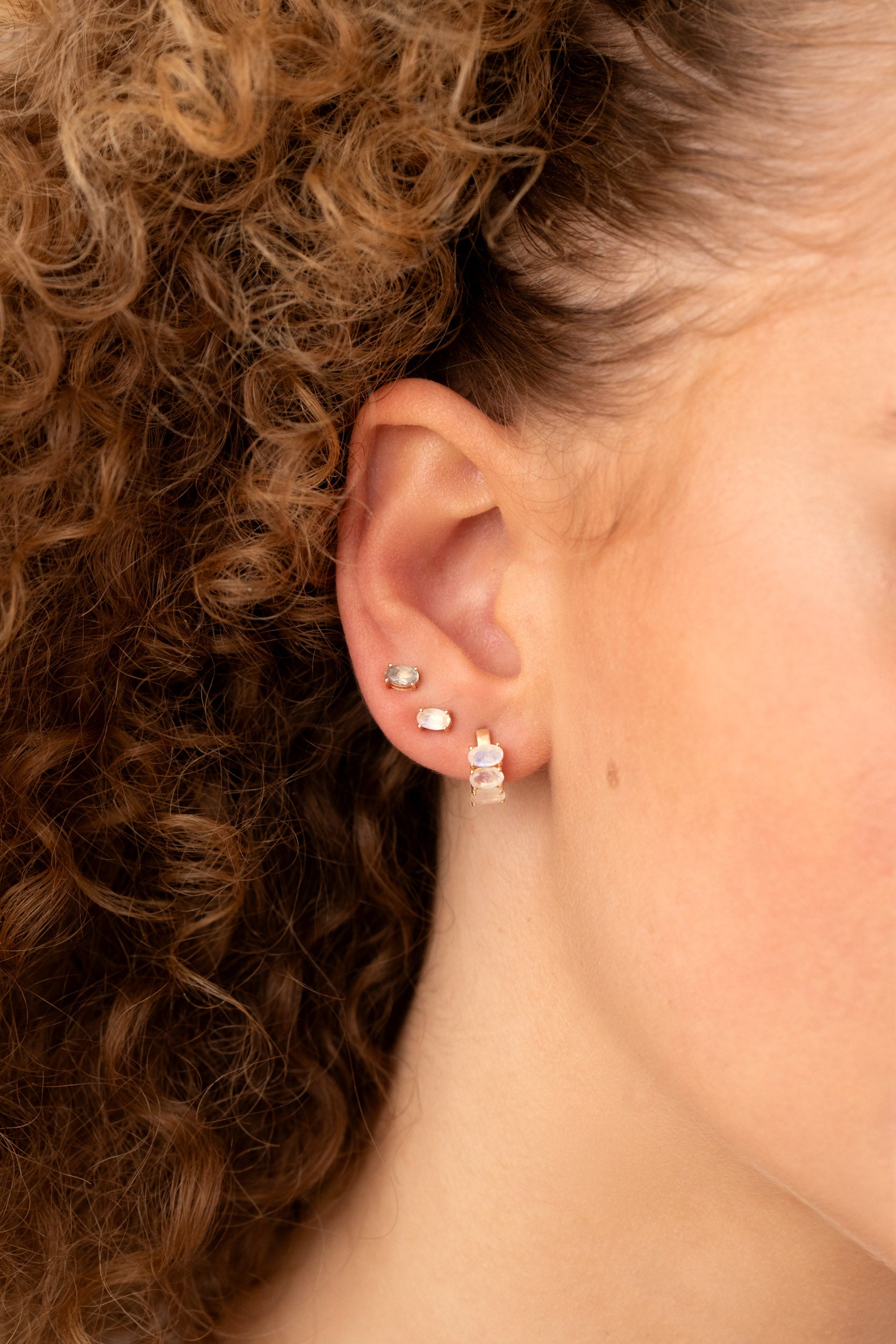 exemple d'une oreille avec accumulation de 3 boucles d'oreilles en pierre de lune marque orphée bijoux , une  premièere mini créole qui comporte 3 pierre de lune ovale - créole - boucle d'oreille - pierre fine - stacking 2 puces et 1 mini créole - pierre précieuse et or