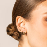 photo d'oreille avec 4 trous et une accumulation de boucle d'oreille noir 2 petites créoles et 2 puces onyx noir super chic et classe